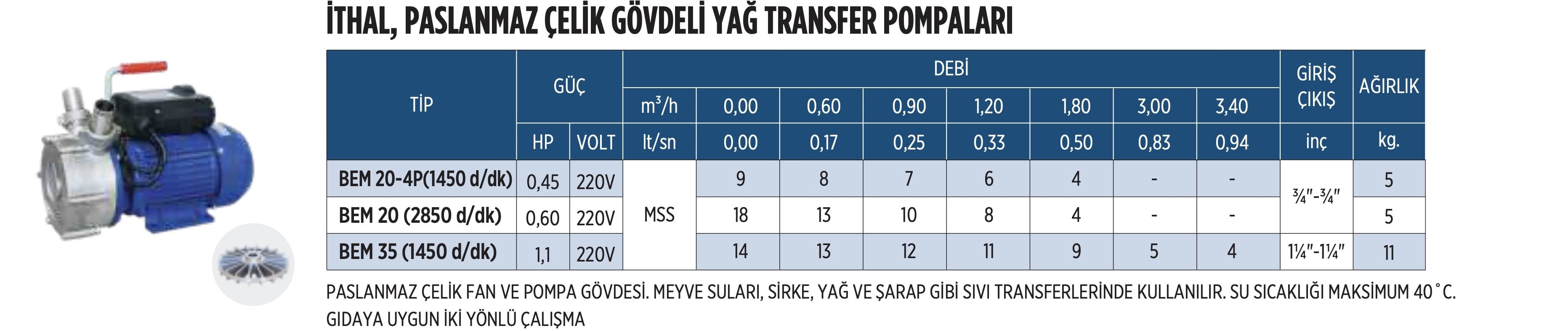 Bem 20-4P Sıvı Gıda Pompası 0,6 HP Çin Malı / Çift Yönlü Çalışmaya Uygun - 1450 Devir/ dakika
