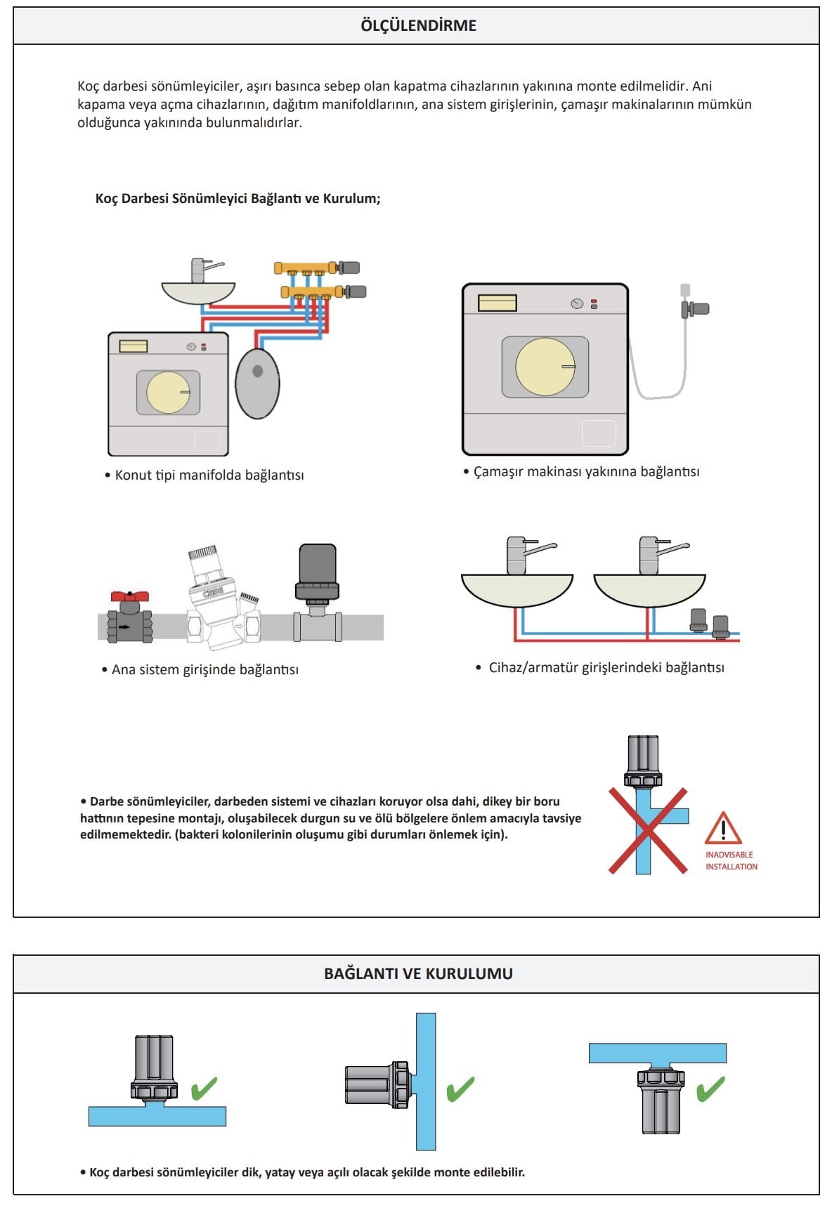 Konum: Sönümleyici, şokun oluştuğu noktaya (örneğin bulaşık makinesi girişi veya hızlı kapanan bir vana) mümkün olduğunca yakın monte edilmelidir.