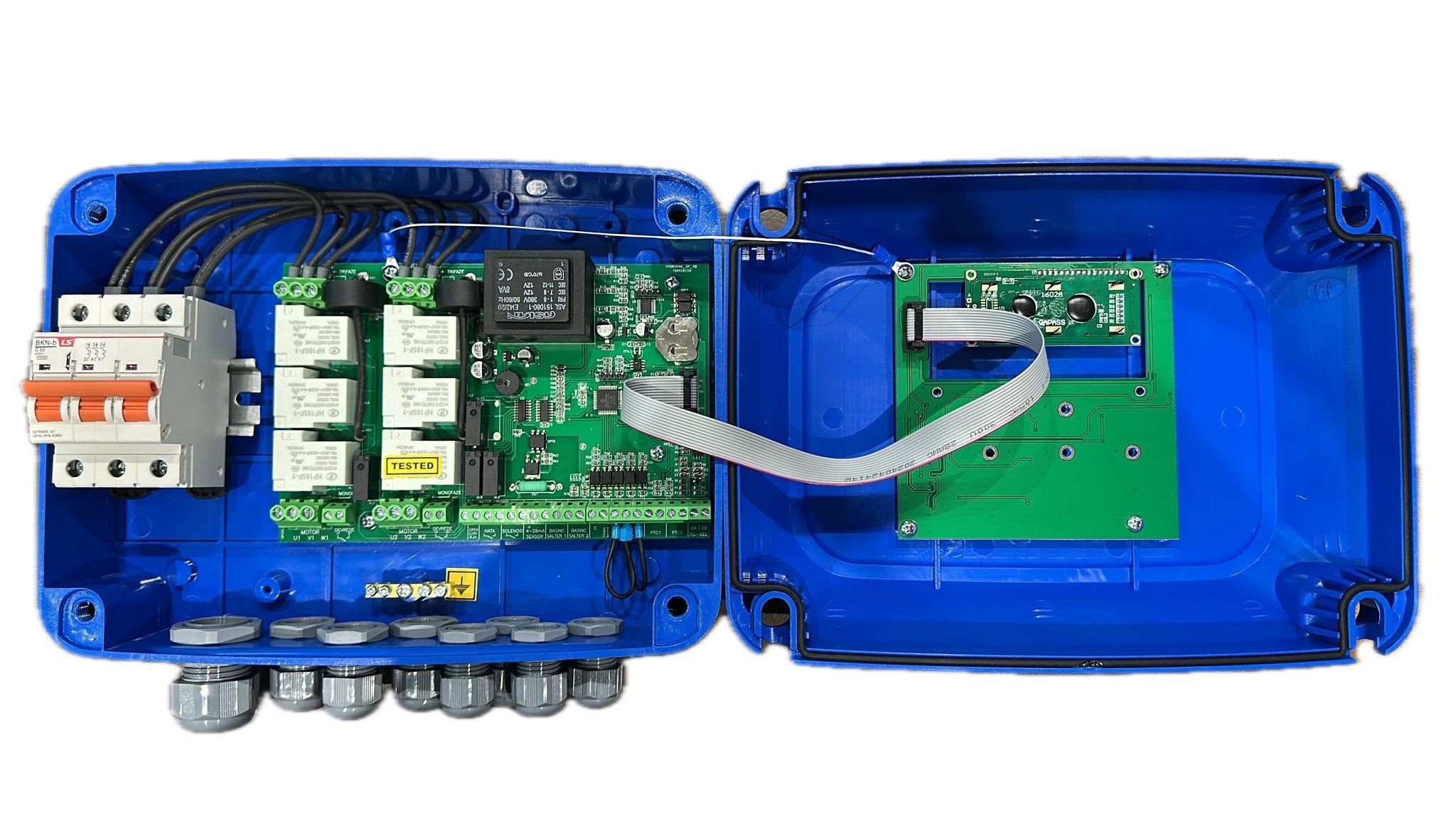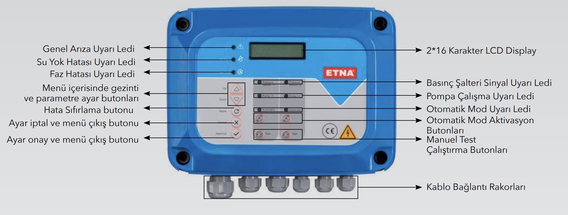 - Üst versiyon olarak; genel arıza, selenoid röle çıkışı ve her pompa için çalışıyor kuru kontağı