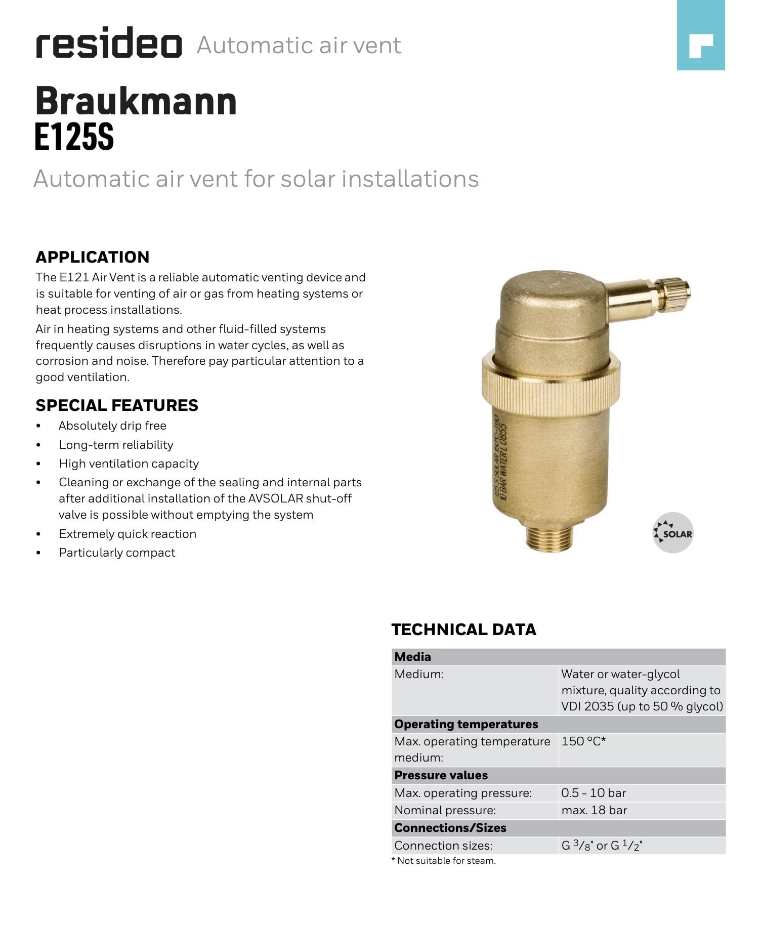 Resideo Braukmann E125S-1/2A Solar Otomatik Purjör 1/2'' - 150 °C