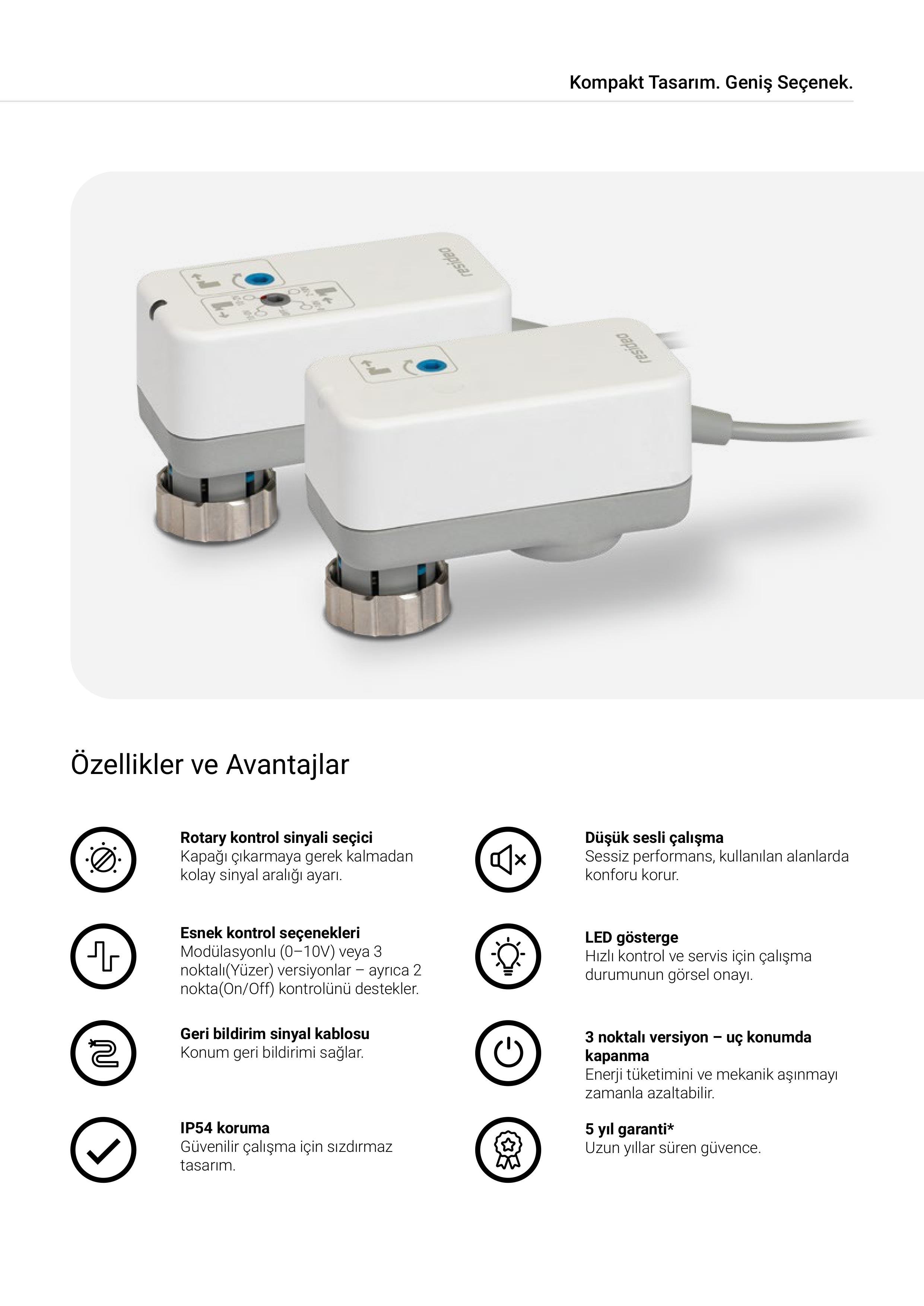 Yeni küçük lineer aktüatör serimiz, ticari ısıtma ve soğutma sistemlerindeki hidronik vanalar için kompakt ve enerji tasarruflu kontrol imkanı sunar. Hızlı kurulum, kolay bakım ve esnek kontrol için tasarlanan bu aktüatörler, fan coil üniteleri, klima santralleri, ısıtma üniteleri ve diğer bölgesel uygulamalar için idealdir. Modülasyonlu (MSLM) veya 3 noktalı (MSHF/MSLF) versiyonları mevcuttur ve hem PICV'ler hem de lineer vanalarla uyumludur.
