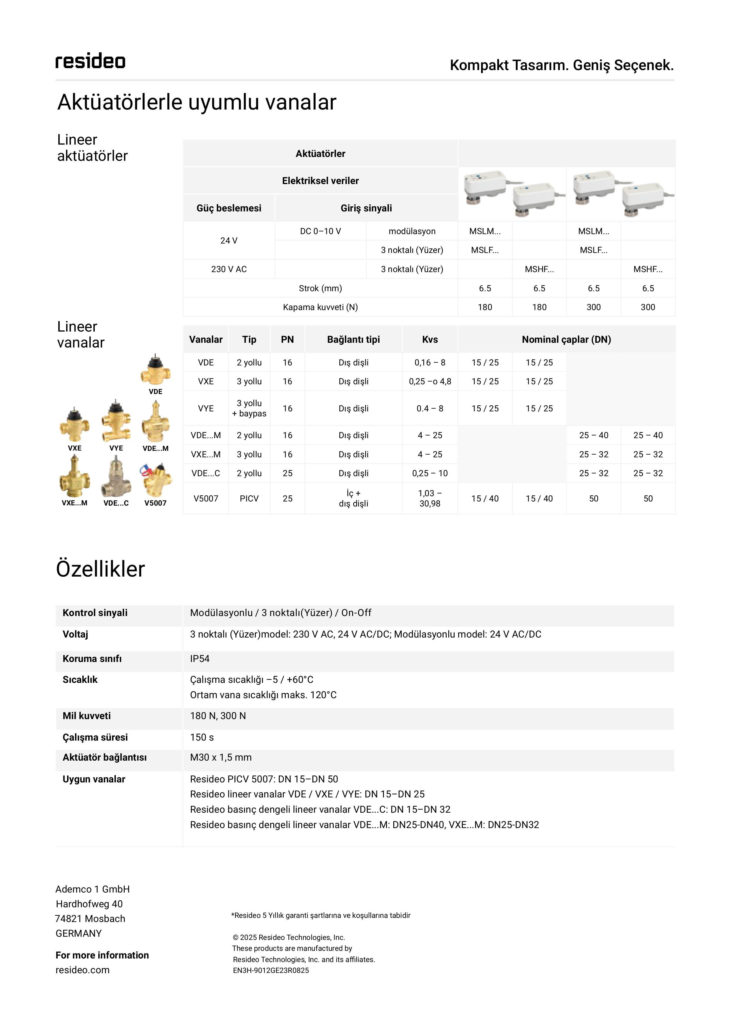 Resideo lineer vanalar VDE / VXE / VYE: DN 15–DN 25