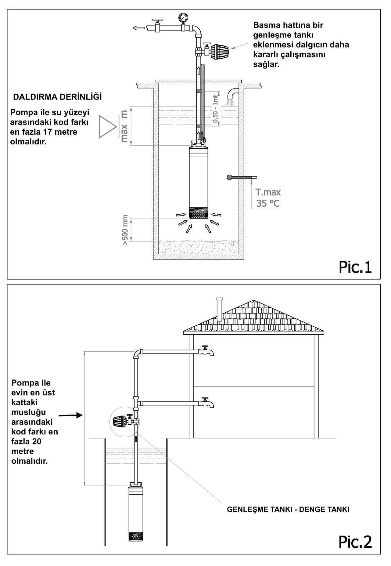 Cihaz bir kuyu yada su deposundan, doğrudan eve basan bir hidrofor olarak kullanılacaksa, basma hattı üzerine 8 litre hacminde bir denge tankı takmanız tavsiye edilir. Pompa emiş kısmı, kuyu zemininden 50 cm yukarıya asılmalıdır. Cihazı reset etmeniz gerektiğinde fişini çıkartıp takmanız yeterlidir. Bu hidroforlu dalgıç pompa, zeminde bulunan bir su deposundan bastığını düşünülürse 4 kat 4 daireye yeter kapasitedir. Otomatik sulamada ise 4 ila 10 adet arası sprink fıskiyeyi kaldırabilir. Sprink sayısı her bir sprinkin debisine ve kaç derece su attığına bağlıdır.