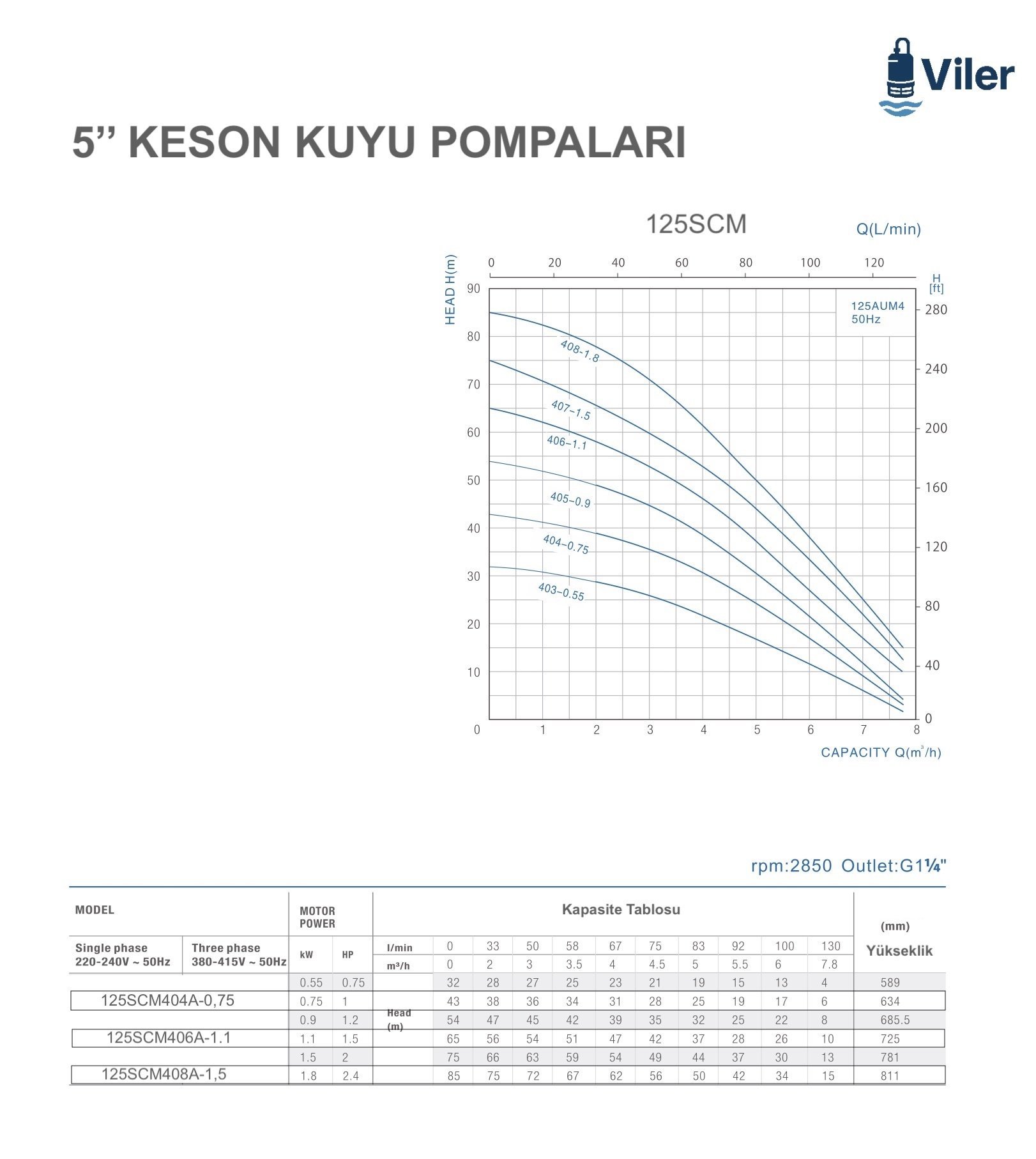 Viler 125SCM408A-1.5 Keson Kuyu Pompası - 2 Hp - 75 metre