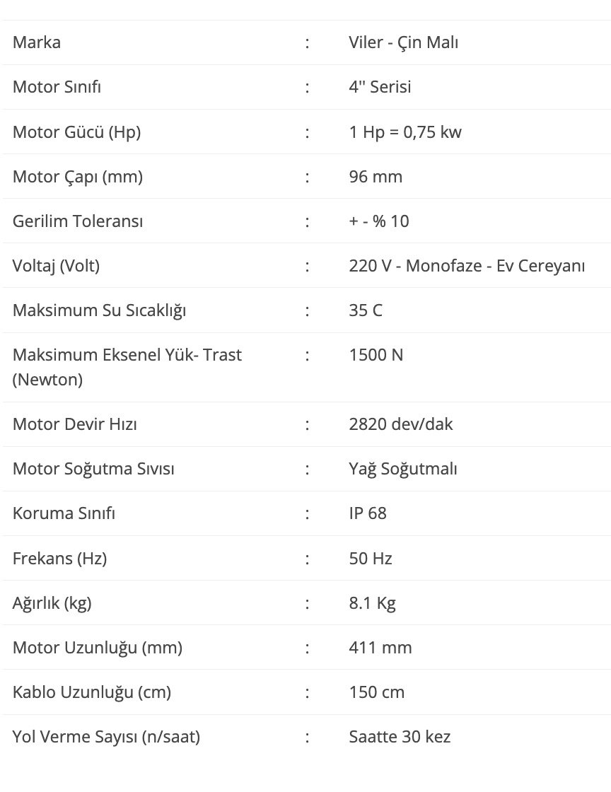 * Dalgıç motorlarını satın alırken, eğer elinizde yoksa uygun kapasitedeki hidrolik kısmı da sipariş etmeyi unutmayınız.